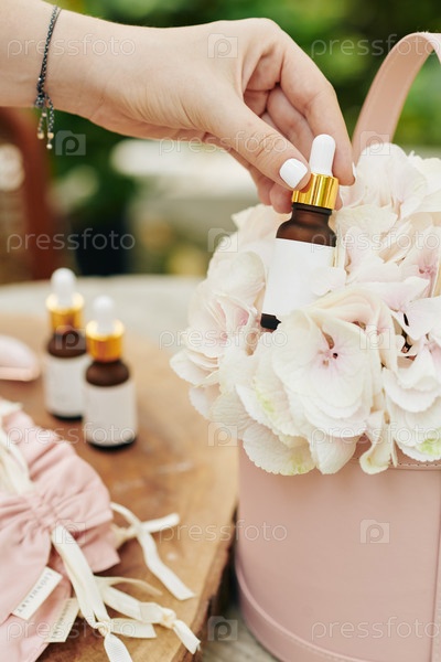 Деловая женщина кладет сыворотку в коробочку с цветами