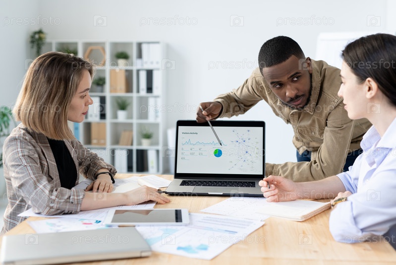 Уверенный в себе молодой бизнесмен африканской этнической принадлежности смотрит на одного из своих коллег