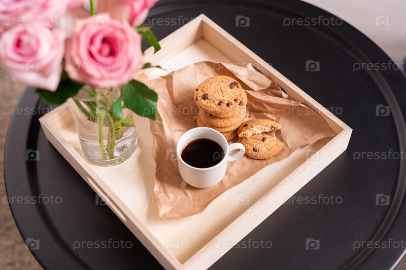 Низкая квадратная картонная коробка с чашечкой кофе и хрустящими печеньями на бумаге