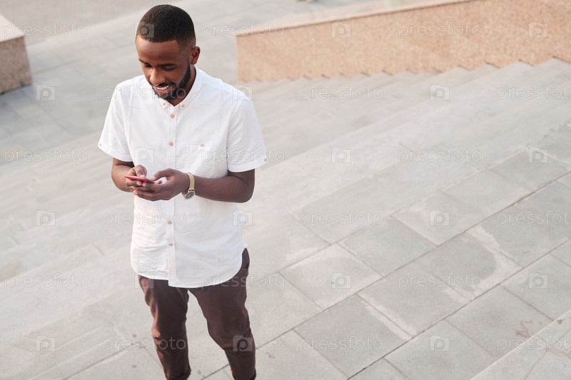Юный бородатый африканский бизнесмен в белой рубашке и коричневых брюках, отправляющий сообщения