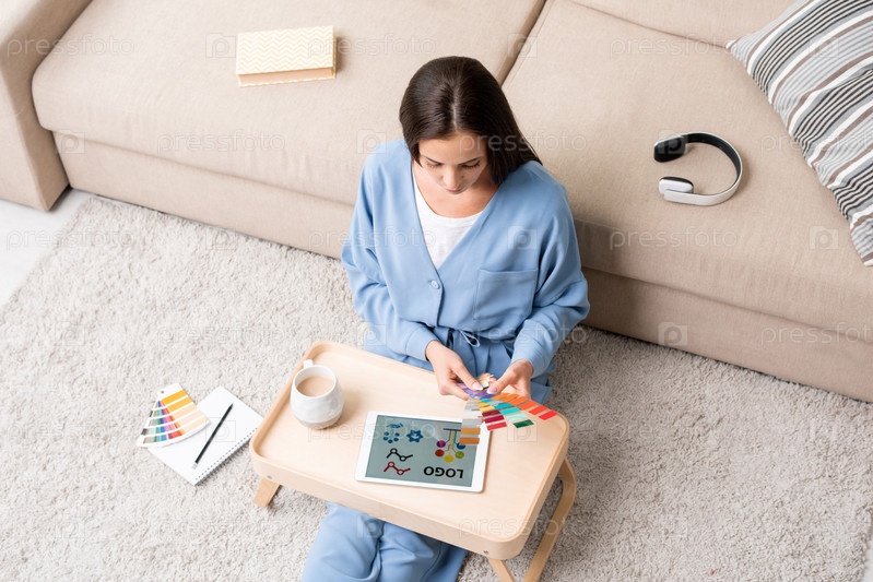 Молодая брюнетка-дизайнер в синей пижаме выбирает цвета для нового логотипа