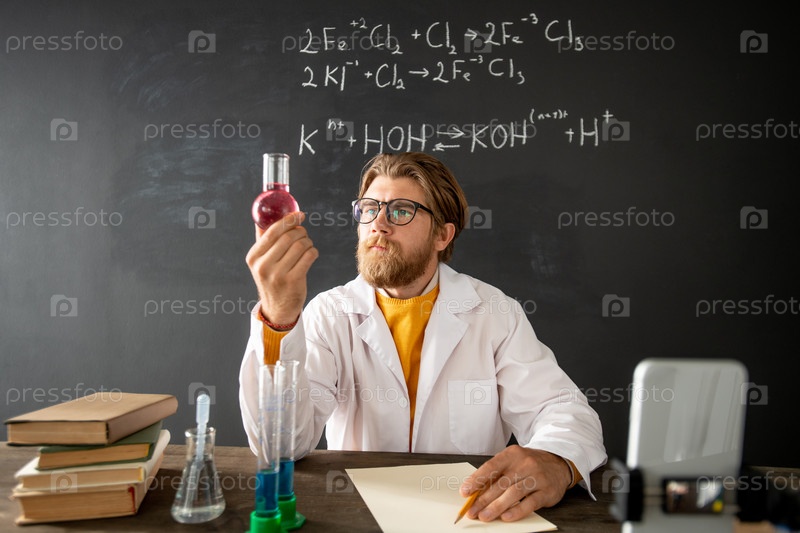 Бородатый учитель химии смотрит на трубку с розовой жидкой субстанцией