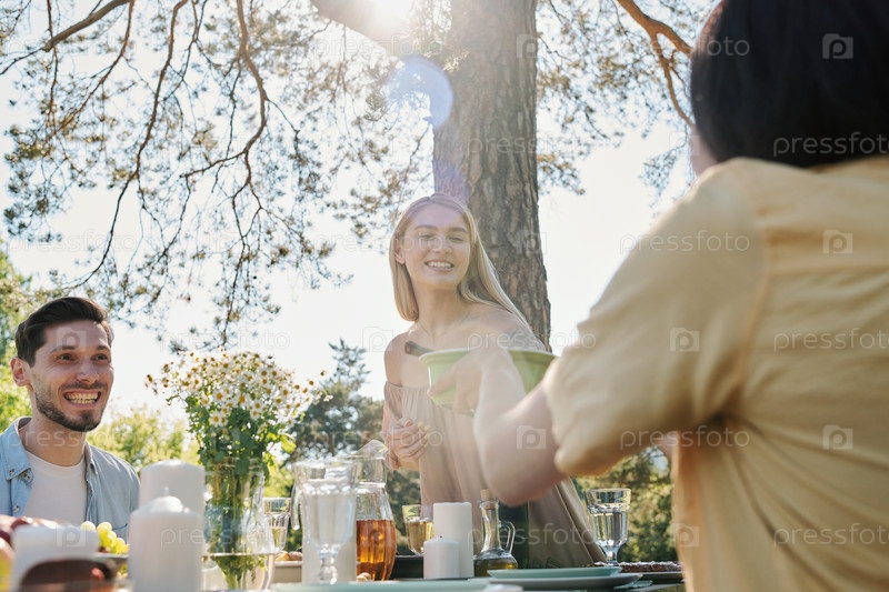 Счастливая молодая блондинка берет пластиковый контейнер с салатами на подаваемый стол