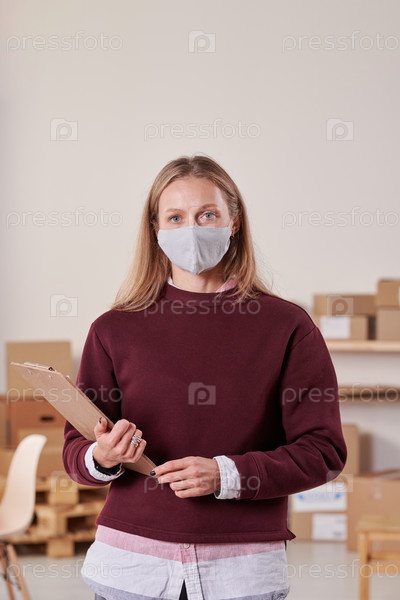Портрет молодой хранилищной женщины в маске и свитере, стоящей со скатертью на картонных ящиках на складе