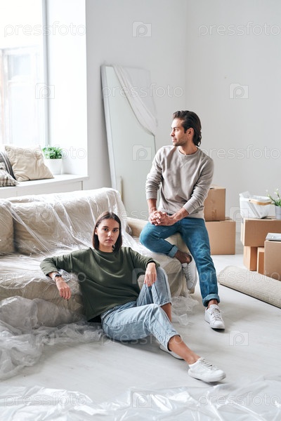 Молодая усталая женщина и ее муж в повседневной одежде отдыхают у дивана возле окна