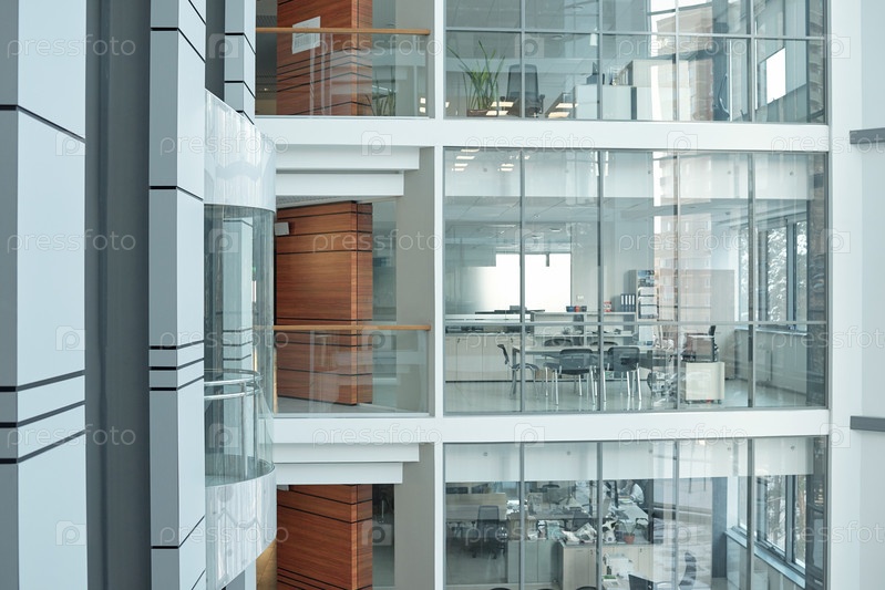 Несколько этажей внутри большого бизнес-центра с балконами, окнами и офисами