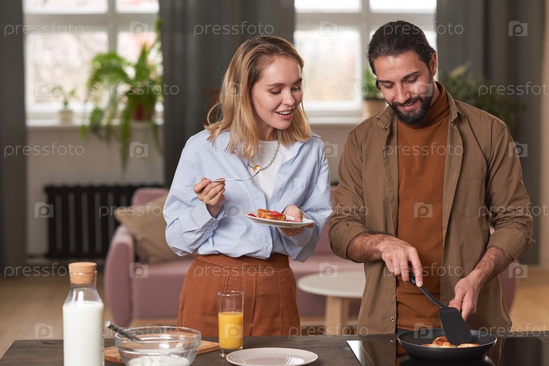 Красивый бородатый мужчина и его блондинка девушка проводят утро вместе дома, готовя вкусный завтрак, копирование пространства