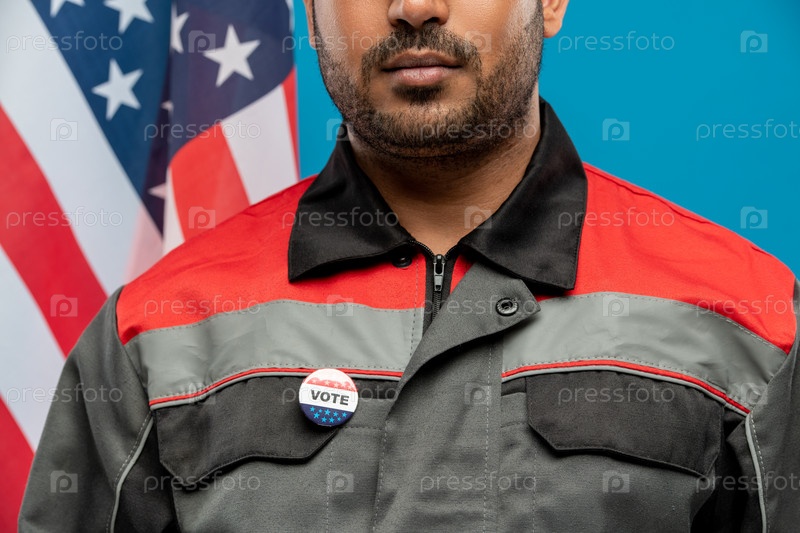 Молодой серьезный ремонтник испаноязычной этнической принадлежности с избирательными значками на форме