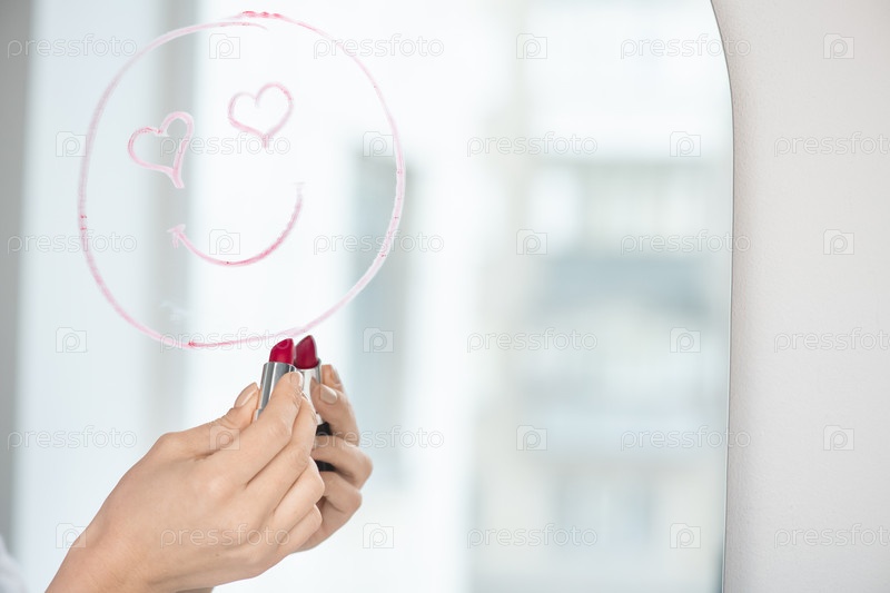 Рука молодой влюбленной женщины, рисующей лицо с улыбкой и глазами в форме сердца