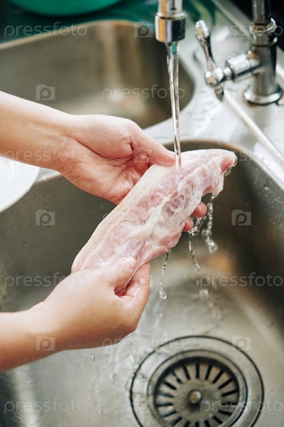 Женщина промывает кусок бекона