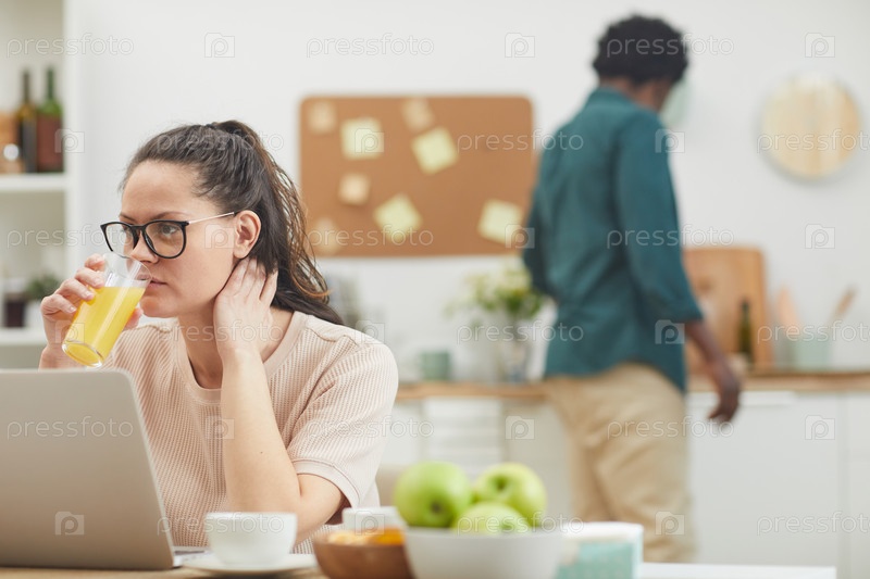 Женщина, использующая ноутбук во время завтрака