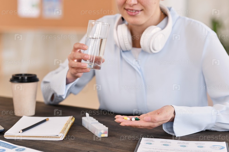 Близкий план улыбающейся молодой женщины с наушниками, сидящей за деревянным столом и пьющей воду во время приема витаминов для улучшения мозговой активности в офисе