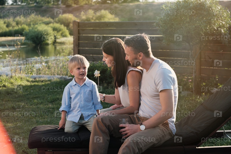 Семья из трех человек отдыхает на свежем воздухе