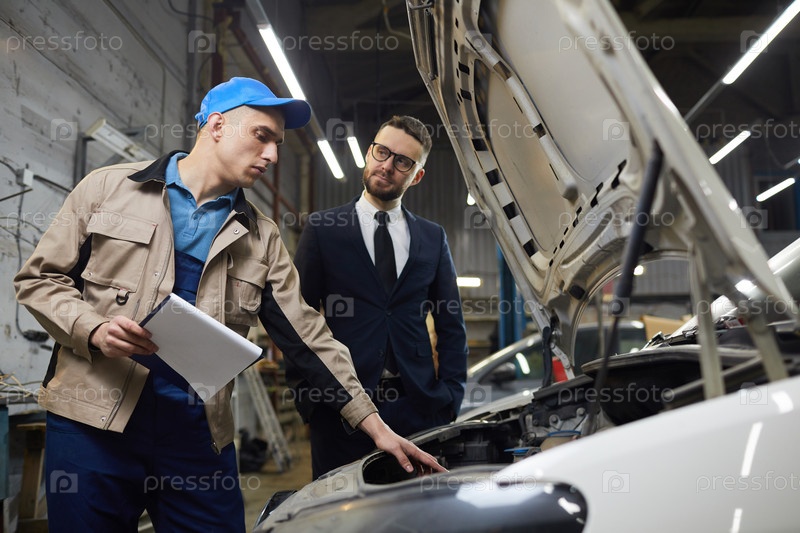 Автомеханик объясняет что-то клиенту