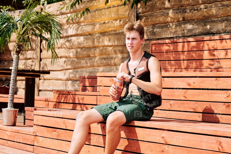 Молодой спортсмен в зеленых шортах и спортивной защитной куртке открывает бутылку воды