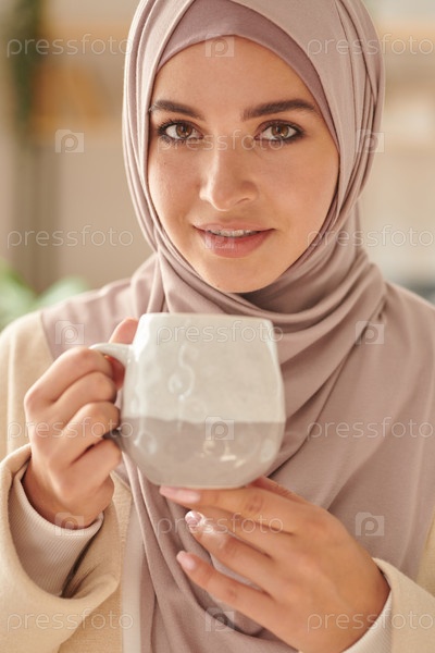 Вертикальный средний крупный портрет молодой мусульманки в бледно-розовом плато, держащей белую чашку чая и смотрящей на камеру