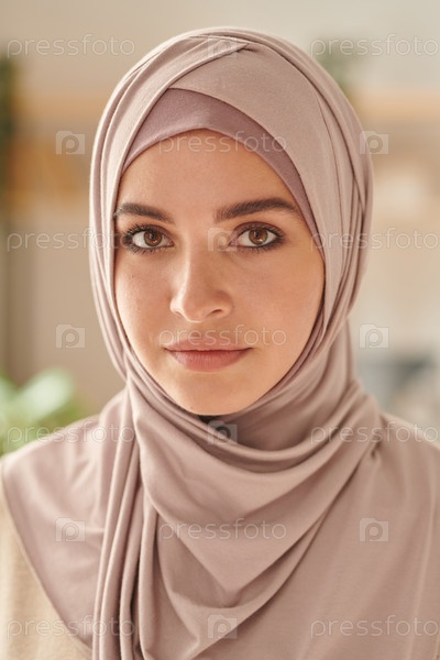 Вертикальная голова и плечи крупный портрет привлекательной мусульманки в светло-розовом хиджабе, смотрящей на камеру