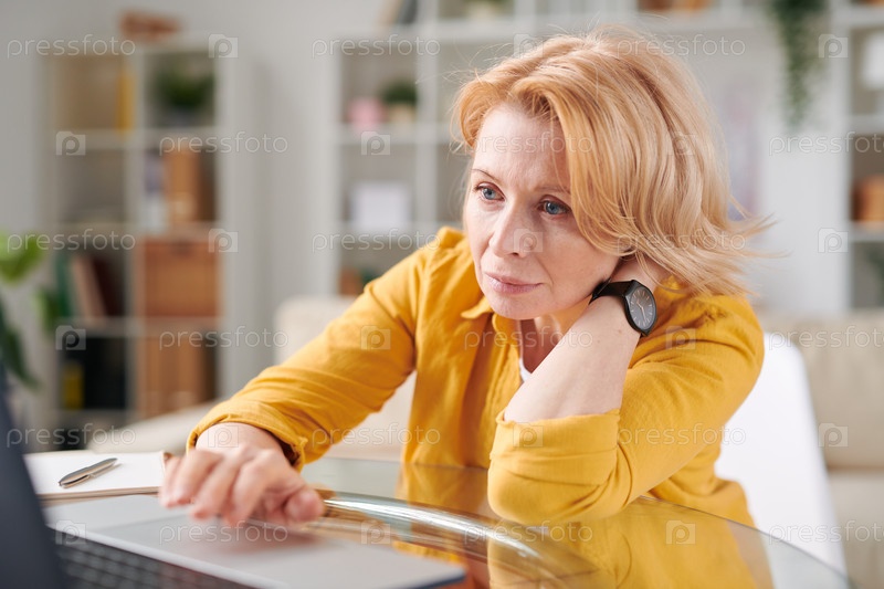 Зрелая серьёзная женщина концентрируется на серфинге в сети, работая удаленно
