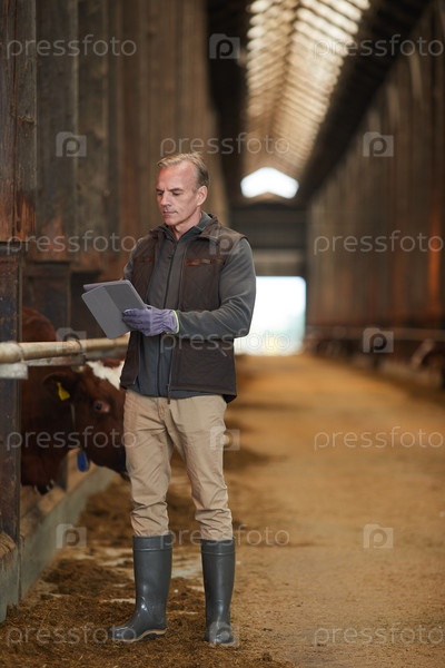 Зрелый мужчина использует планшет на ферме