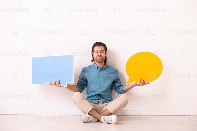 Молодой спокойный мужчина в джинсовой рубашке и белых брюках держит два пустых пузыря речи
