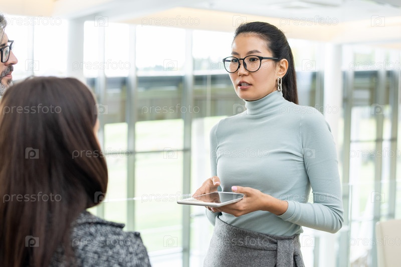 Молодая женщина-менеджер офиса в повседневной одежде и очках разговаривает с коллегой
