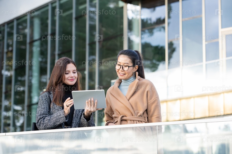 Две молодые успешные межкультурные бизнес-женщины, которые ищут товары в Интернете