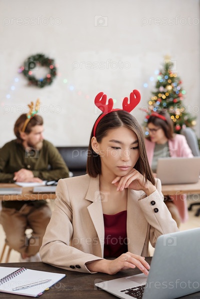 Молодой красивый азиатский офисный менеджер в рождественских головных уборах смотрит на дисплей ноутбука