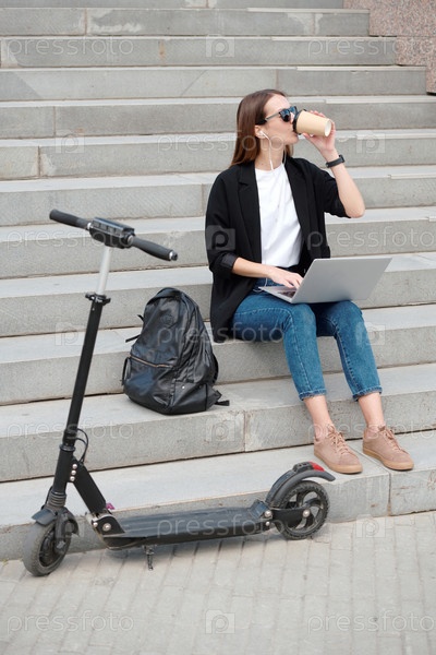 Молодая красивая студентка в повседневной одежде и солнцезащитных очках, выпившая стакан кофе