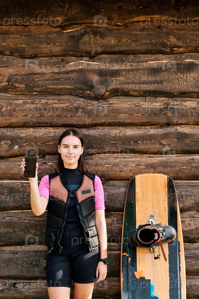 Молодая женщина-серфер в защитном жилете и спортивной одежде показывает фотографию на телефоне