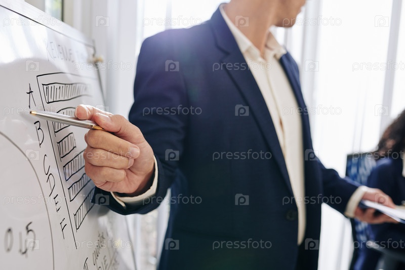 Предприниматель указывает на схему на доске