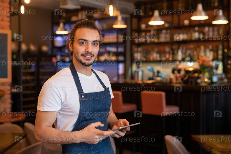 Современный молодой красивый официант с планшетом, принимающий онлайн-заказы клиентов