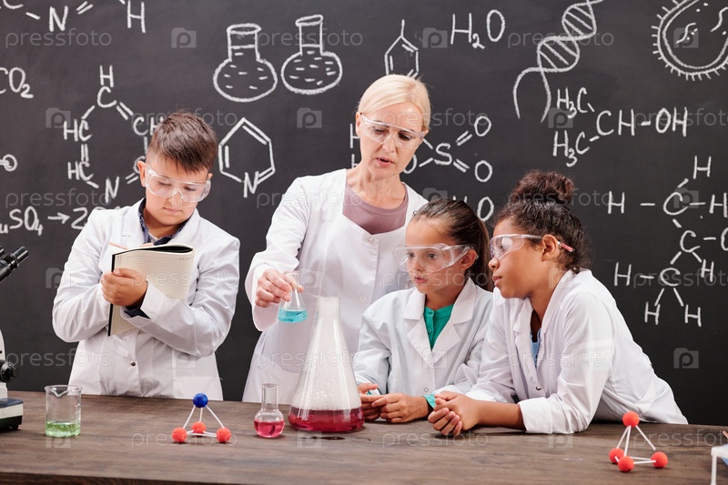 Группа умных учеников средней школы во время химического эксперимента