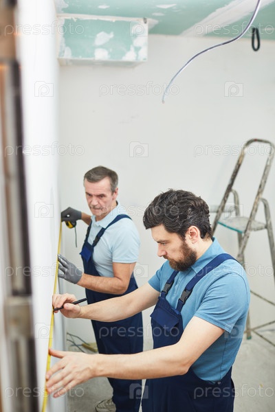Строительная команда измеряет сухую стену