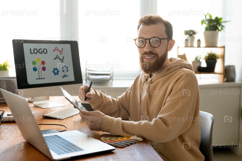 Молодой веселый и креативный мужчина-фрилансер рисует логотип на рабочем месте