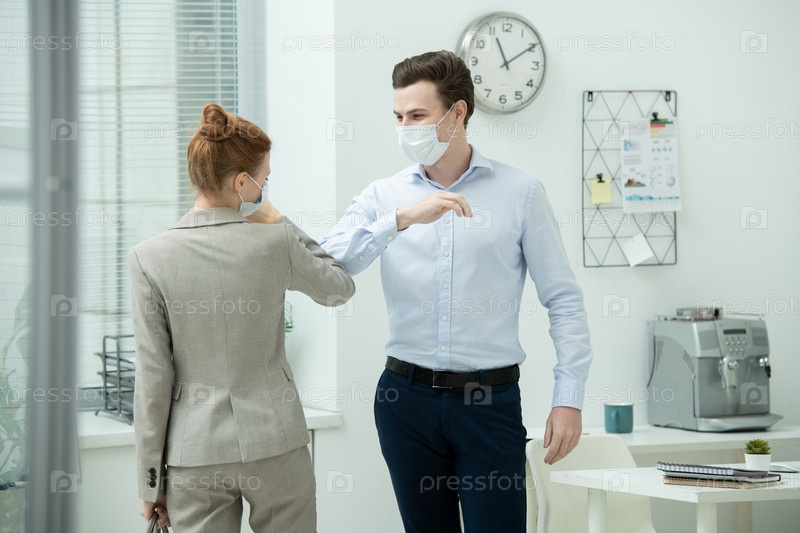 Два молодых офисных менеджера в защитных масках дают друг другу локтевой удар