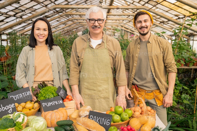 Старший фермер, продающий органические продукты с молодыми помощниками