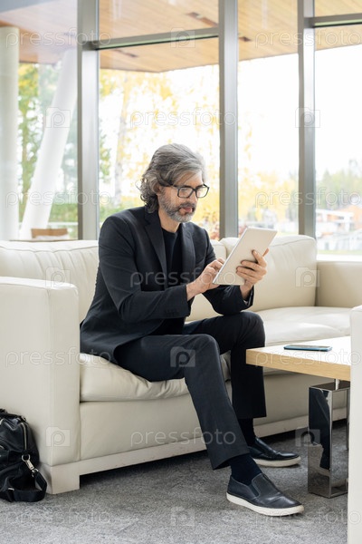 Серьезный зрелый брокер в костюме и очках анализирует финансовые данные онлайн