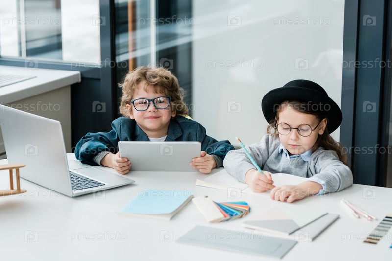 Милый школьник с планшетом смотрит на тебя, сидя рядом со своим одноклассником