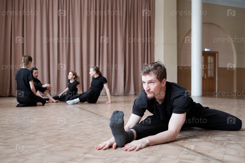 Молодой человек в гибкой черной активной одежде, сидящий в положении веревки во время тренировки