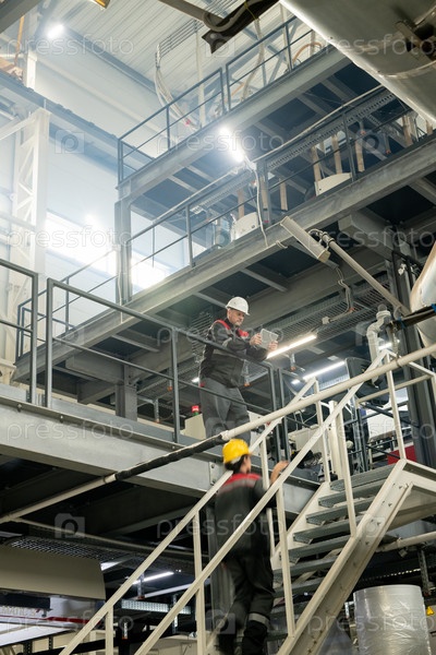 Предводитель с планшетом наклоняется над лестницей, где женщина-работница движется вверх