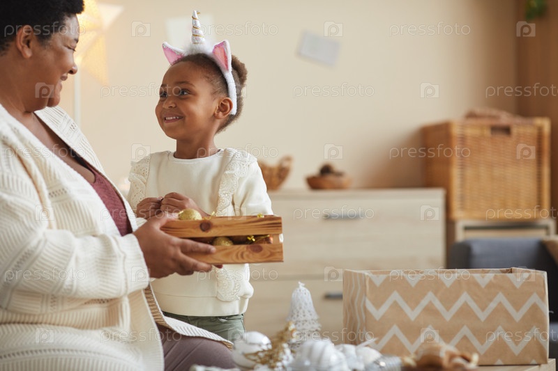 Маленькая девочка украшает Рождество с бабушкой
