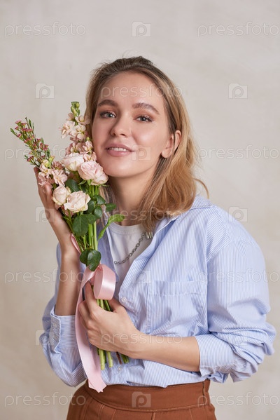 Средний студийный портрет очаровательной женщины, держащей букет цветов и улыбающейся на камеру