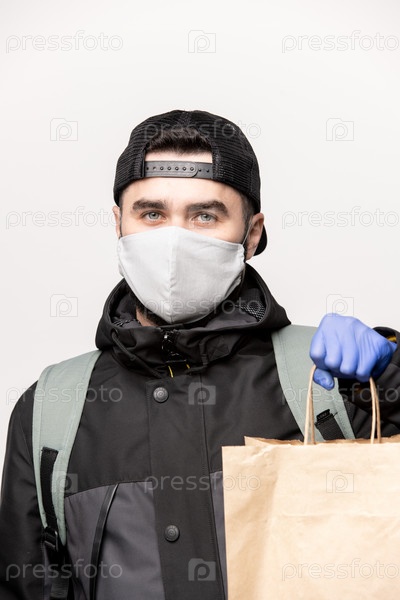 Парень в черной куртке и шляпе с рюкзаком, держащий бумажный пакет со своим заказом