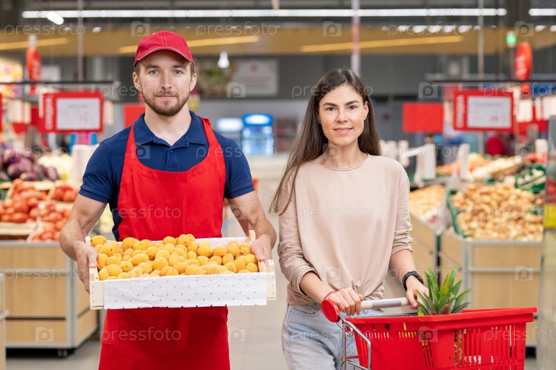 Работница магазина и женщина с корзиной