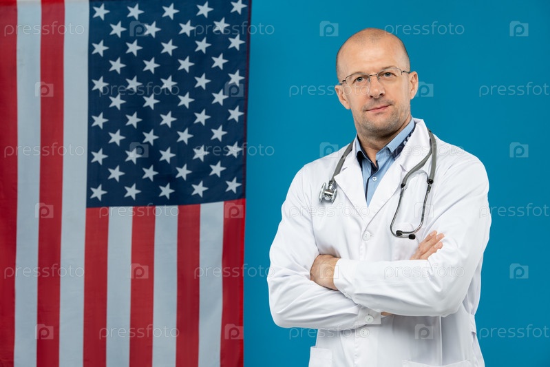 лысый зрелый клиник в белом халате, скрестивший руки за грудь против американского флага