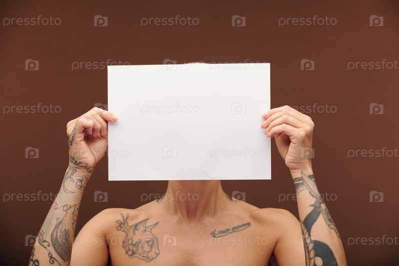 Молодая мужская женщина с татуировками на руках, груди и шее, держащая в руке пустую бумагу