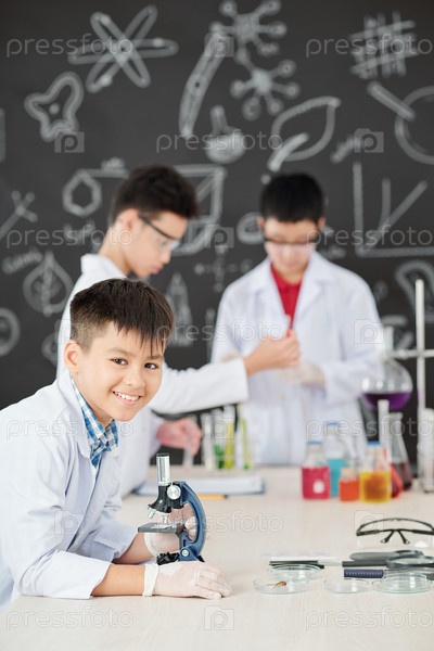 Счастливый школьник с микроскопом