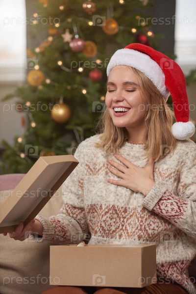 Вертикальный средний портрет молодой женщины, одетой в обычный теплый свитер и красную шляпу Санты, сидящей на диване с чувством волнения после получения рождественского подарка