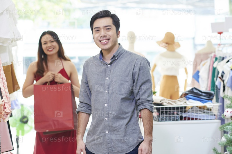 Веселый мужчина в универмаге
