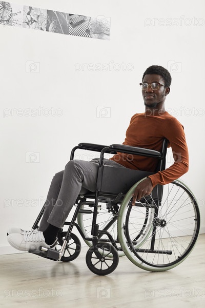 Молодой афроамериканец в инвалидном кресле посещает художественный музей